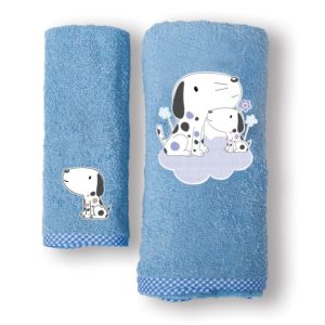 Σετ Παιδικές Πετσέτες 2 τεμαχίων με κέντημα Σκυλάκια Σιέλ/Puppy Blue Sbaby